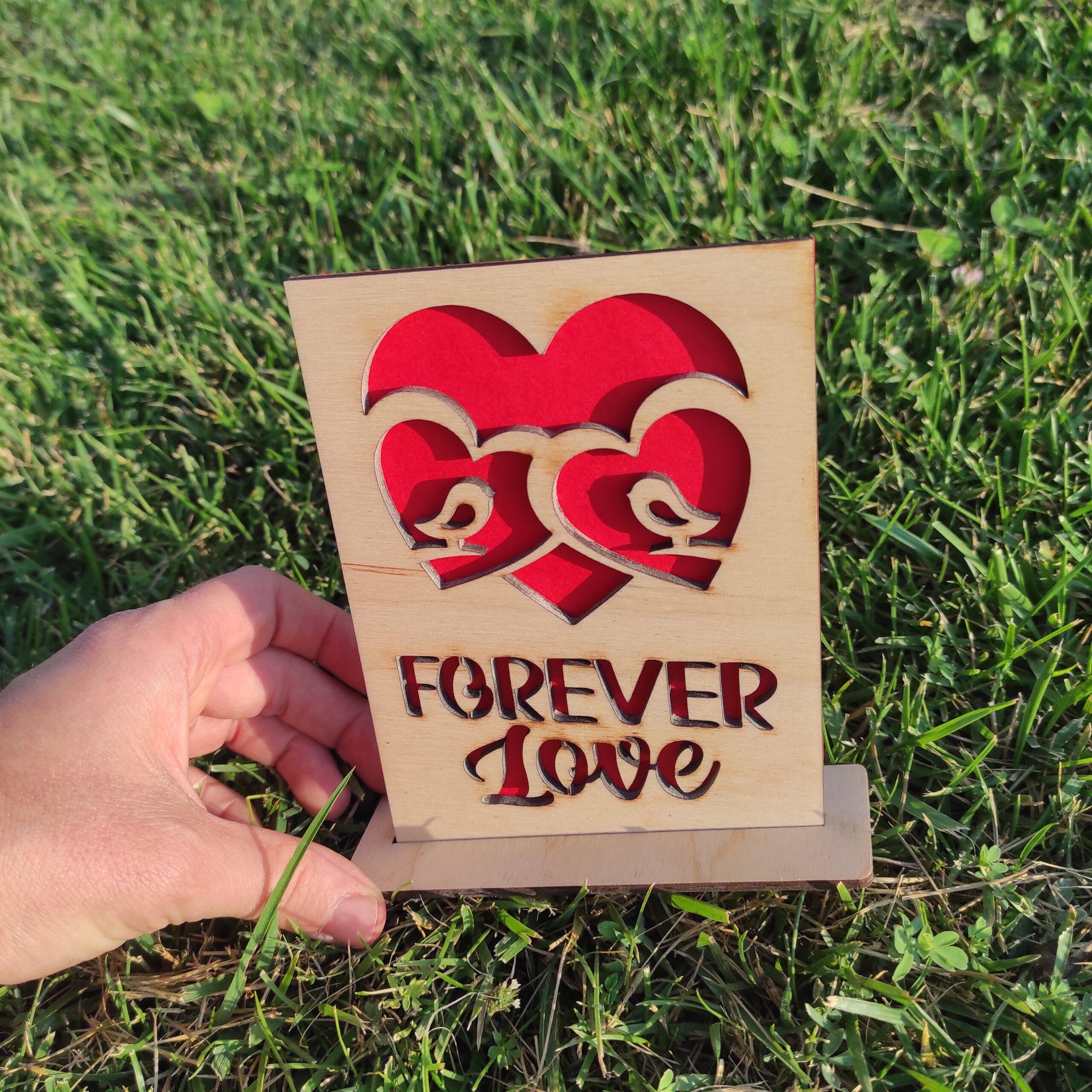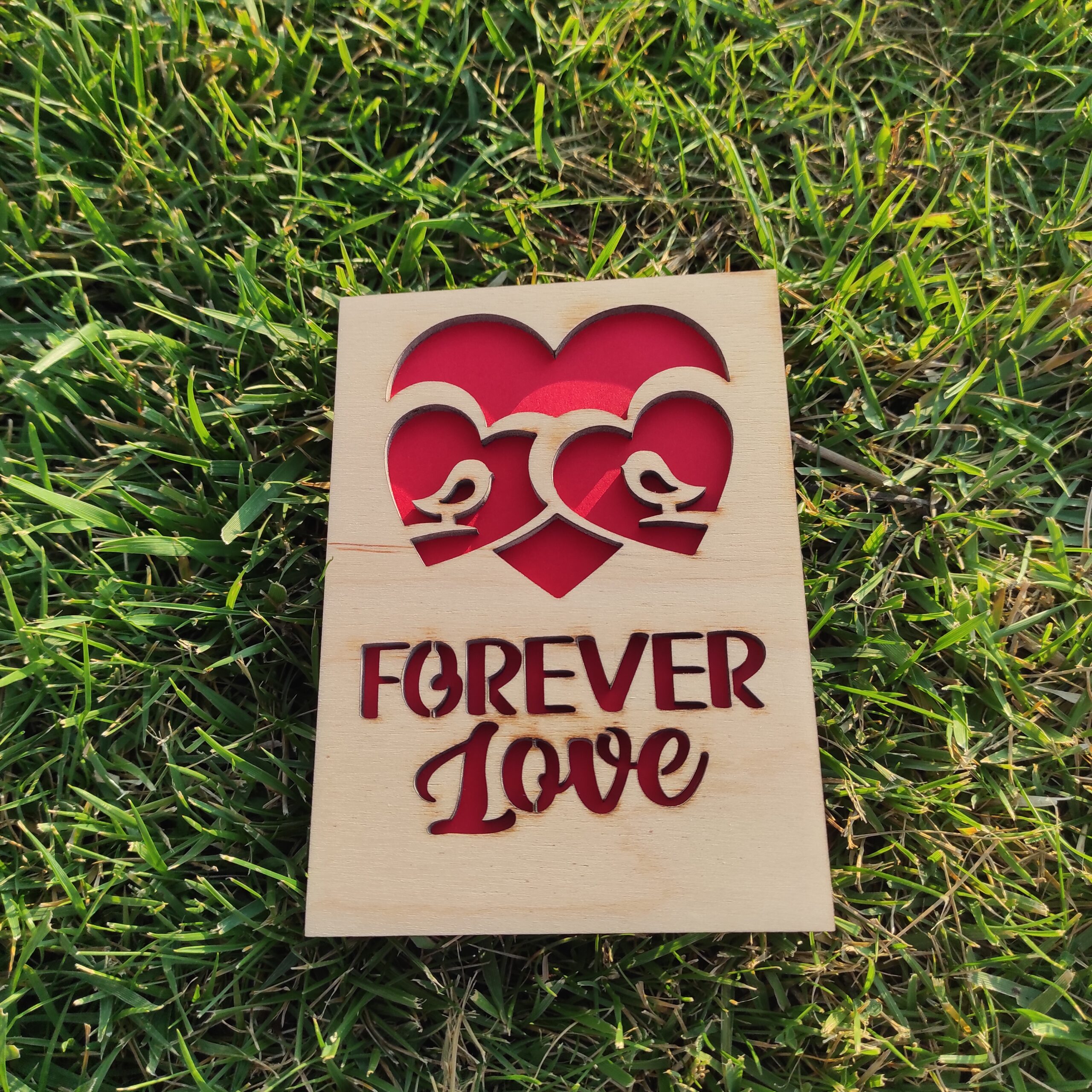 Покажете на половинката си колко я/го обичате с тази дървена картичка, изработена от шлайфан шперплат 4 мм (бреза). Лазерно гравираният надпис „Forever Love“ и две изрязани сърца с птички са идеален романтичен подарък, който ще остане скъп спомен завинаги.